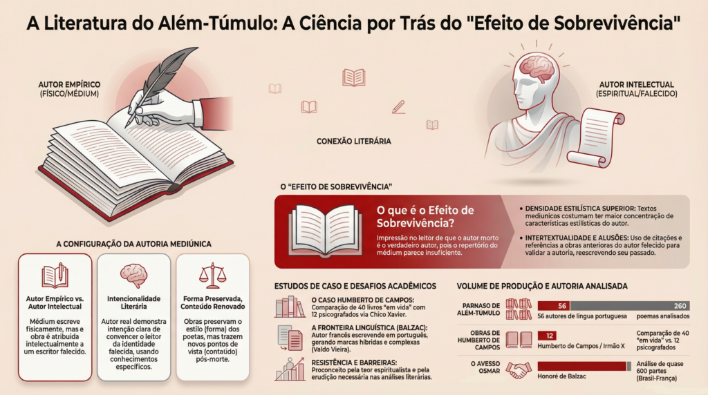 O acadêmico Alexandre Caroli discute suas pesquisas sobre o universo literário mediúnico, focando na análise de textos psicografados atribuídos a autores renomados. Ele explora o conceito de efeito de sobrevivência, em que obras psicografadas por médiuns como Chico Xavier e Waldo Vieira reproduzem estilos complexos e conhecimentos específicos que sugerem a autoria intelectual dos escritores já falecidos.