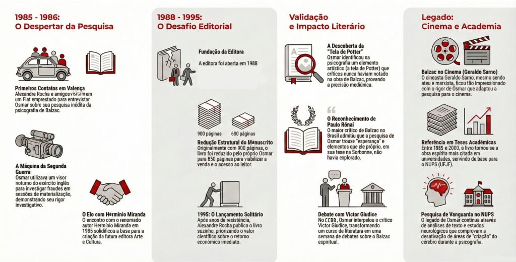 Neste vídeo, Alexandre Rocha apresenta um relato sobre a trajetória de Osmar Ramos Filho e sua rigorosa investigação acerca da psicografia de Honoré de Balzac. A narrativa destaca o desenvolvimento do livro resultante dessa pesquisa, sublinhando como a obra desafiou ceticismos e se tornou um pilar para o estudo acadêmico do espiritismo no Brasil. Alexandre detalha encontros marcantes com figuras como Hermínio Miranda e o crítico Paulo Rónai, além de mencionar a utilização de tecnologias curiosas para desmascarar fraudes mediúnicas.
