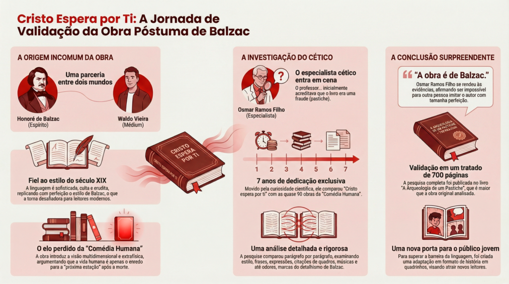 Neste vídeo, Málu Balona explora a origem da obra “Cristo espera por ti”, escrita por meio de um fenômeno de psicografia avançada entre o autor francês Honoré de Balzac e o propositor da conscienciologia, Waldo Vieira. A narrativa destaca a investigação de sete anos realizada pelo renomado intelectual Osmar Ramos Filho, que inicialmente duvidava da autenticidade do texto devido ao estilo complexo e detalhista do escritor original.