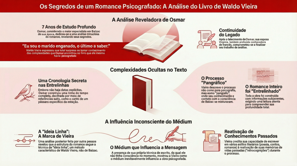 Neste vídeo, Waldo Vieira apresenta um depoimento sobre a análise técnica e literária realizada por Osmar Ramos Filho a respeito de uma obra psicografada pelo próprio Waldo, o livro “Cristo Espera por ti”, décadas antes. Waldo destaca o conhecimento excepcional de Osmar sobre Honoré de Balzac, superando até estudiosos franceses ao identificar uma complexa cronologia subjacente e detalhes ocultos nas entrelinhas do romance. Waldo admite que, na juventude, desconhecia a profundidade do material que recebia, compreendendo o valor da obra apenas após o rigoroso estudo de sete anos feito por Osmar. A narrativa também explora o conceito de pangrafia, onde a bagagem cultural e as experiências passadas do médium influenciam diretamente a estrutura do texto. Por fim, menciona a aplicação da técnica da ideia-língua no livro, um recurso próprio de Waldo que diferencia o estilo dessa obra das produções originais do autor francês.