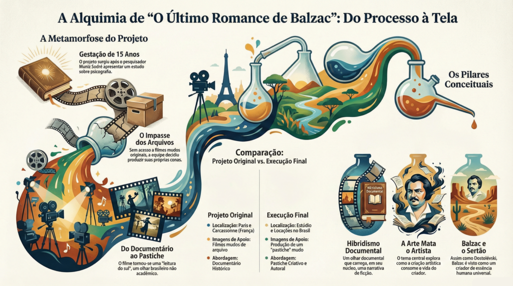 O segmento documental foca no mistério de como o fenômeno da psicografia pode revelar aspectos da obra de Balzac. Já a parte ficcional encena um dos temas centrais do autor: a ideia de que “a arte mata o artista”. Sarno conecta essa reflexão à modernidade do século XIX e a questões existenciais profundas, chegando a citar Guimarães Rosa para justificar sua proximidade intelectual e afetiva com Balzac, uma conexão que se mostra orgânica, mesmo partindo de uma trajetória cinematográfica anteriormente voltada para o sertão nordestino.